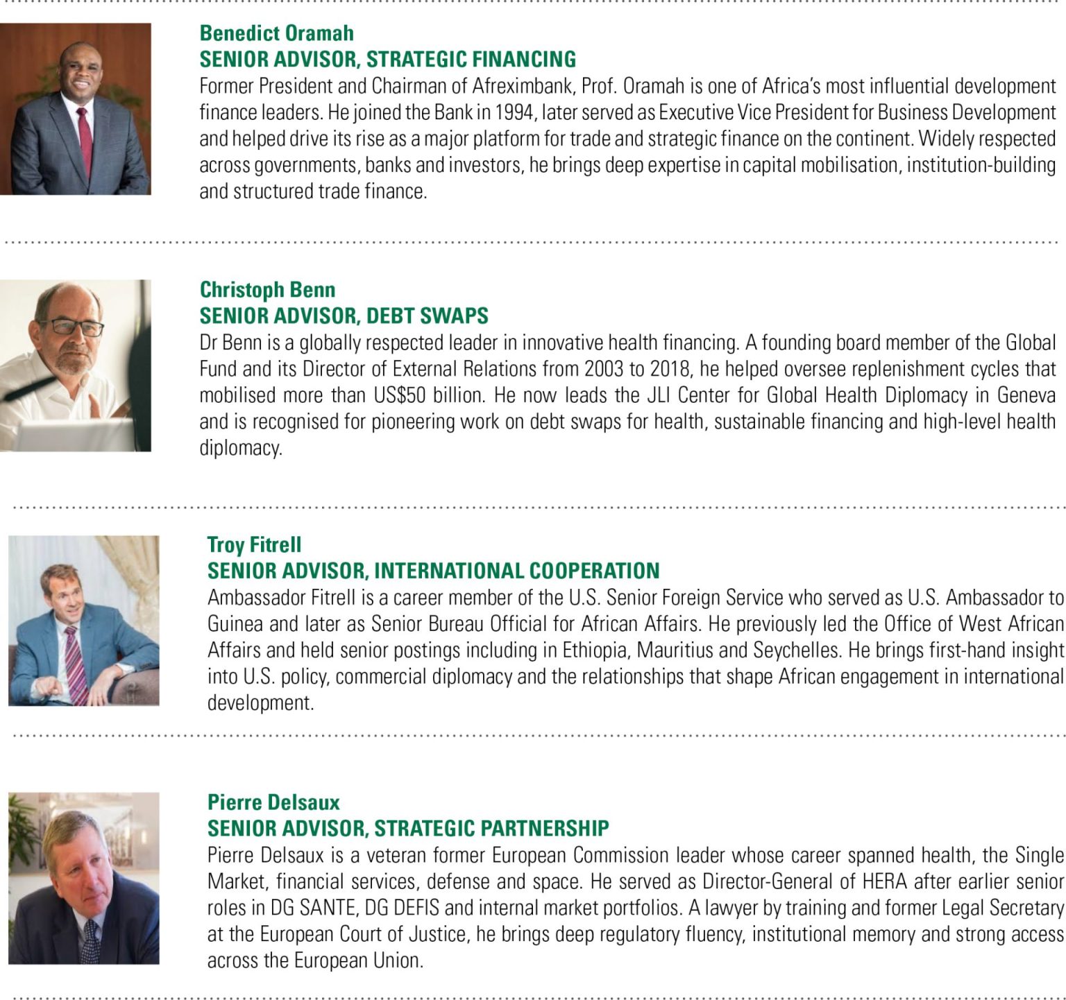 Together, they bring exceptional experience and influence across finance, diplomacy, public policy, and health security. Their appointment reflects Africa CDC’s commitment to assembling the calibre of leadership required to mobilise capital, shape high-level policy, and forge the strategic partnerships needed to advance the Africa Health Security and Sovereignty agenda with greater speed, credibility, and scale.